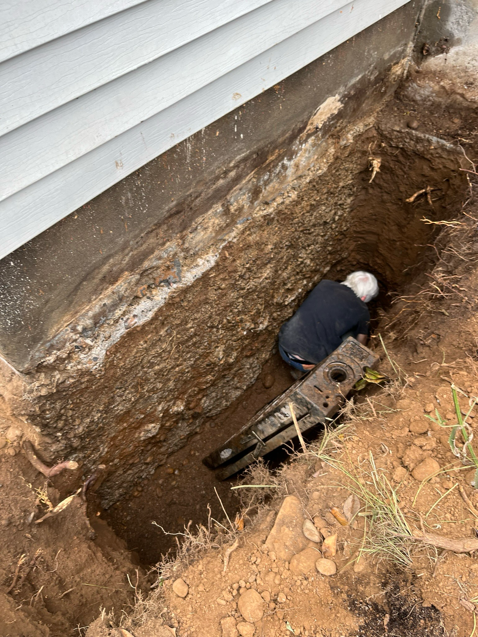 A man is standing next to a drain pipe in a yard.
