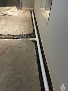 A white pipe is laying in the dirt next to a tree.