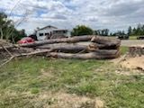 A large tree stump is sitting on top of a trailer.