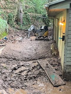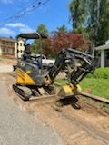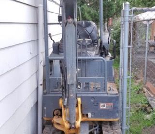 A small excavator is digging a hole in a backyard.