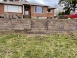 A set of wooden stairs sitting on top of a concrete platform.